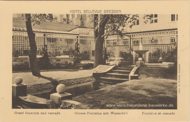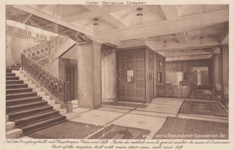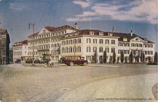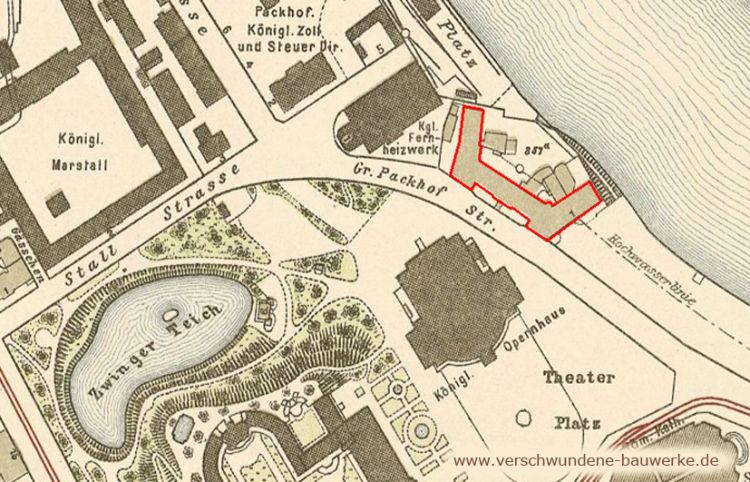 Das Gebäude, auf ehemligem Festungsraum als Zuckerraffinerie errichtet, ist als solche von 1822-1841 genutzt worde, nach entsprechendem Umbau hat es zu Wohnzweckenund als Ausstellungslocal des sächsischen Kunstvereins gedient, aus welchem es 18973 für den Preis von 1.650.000 RM in die Hände einer Actiengesellschaft überging. Es enthält im Souterrain des östliche Flügels (nach dem Theaterplatze) Küchen-, Wirthschafts- und vorrathsräue, im Parterre dergleichen Räume, ferner die Repräsentationsräume des Hauses, den 16,5 m langen, 6,5 m breiten, leider sehr niedriegen Speisesaal, und im Übrigen weit über 100 Logirzimmer."