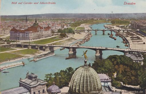 Am Abend des 7. Mai 1945, einen Tag vor Ende des Zweiten Weltkrieges in Deutschland, sprengten Einheiten der Waffen-SS zwei Bögen der Stromöffnungen sowie zwei rechtselbische Vorlandbögen vor der vom Albertplatz vorrückendenden Roten Armee. Die Brückenreste wurde 1947 in Dr.-Rudolf-Friedrichs-Brücke umbenannt. Aufgrund der starken Zerstörung wurde auf einen Wiederaufbau in alter Form verzichtet. 1952 wurden weitere erhaltene Teile demontiert. Am 7. März 1952 wurden die verbliebenen Bogenträger gesprengt.