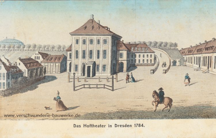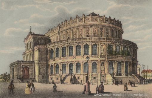 Der vom Baumeister Gottfried Semper errichtete Rundbau in den Formen der italienischen Frührenaissance wurde als eines der schönsten europäischen Theater berühmt. Auch eine oberhalb der Bühne angebrachte Digitaluhr des Dresdner Uhrmachers Gutkaes erregte Aufsehen. Das erste Opernhaus Sempers lag erheblich näher zum Schloss als sein heute noch bestehender zweiter Theaterbau; vor der Oper wurde 1840 der Vorläufer des heutigen Theaterplatzes angelegt. Das erste Königliche Hoftheater wurde am 12. April mit Carl Maria von Webers »Jubelouvertüre« und Johann Wolfgang von Goethes »Torquato Tasso« eröffnet. Hier wirkte Richard Wagner in den Jahren 1843 bis 1849 als Königlich Sächsischer Kapellmeister und bringt er seine Opern »Rienzi« (1842), »Der fliegende Holländer« (1843) und »Tannhäuser« (1845) zur Uraufführung. Am 21. September 1869 wurde das Gebäude bei einem Brand völlig zerstört.