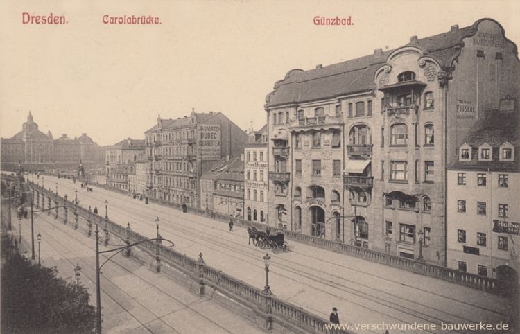 Das erste große Hallenbad der Stadt Dresden wurde am 2. Januar 1906 eröffnet. Möglich wurde der Bau durch finanzielle Mittel aus der Stiftung von Justus Friedrich Güntz (Rechtsanwalt, Redakteur und Eigentümer des Dresdner Anzeigers) Das Gebäude besaß eine repräsentative Fassade mit Jugendstil-Ornamenten, die Sandsteinfassade war mit „aufwendigem figürlichem Schmuck“ versehen worden.Im Inneren gab es zwei getrennte Schwimmhallen für Herren und Damen, wobei die Herrenschwimmhalle eine Beckenfläche von 275 Quadratmetern aufwies. Das Damenbecken maß 162 Quadratmeter (18 x 9 m). Hinzu kamen 50 Wannenbäder für die Bevölkerung der angrenzenden Wohnviertel, deren Häuser meist noch keine Badezimmer besaßen. Außerdem gab es ein irisch-römisches Schwitzbad ein Hundebad sowie einen als "Bad-Café" bezeichneten Erfrischungsraum. In der angeschlossenen Wäscherei konnten Badegäste Kleidungsstücke waschen und bügeln lassen. Bereits im Eröffnungsjahr besuchten über 195.000 Besucher das Güntzbad, bis 1926 wuchs die Zahl der Badegäste auf bis zu 775.000 pro Jahr an. Abends stand das Bad Dresdner Schwimmvereinen zur Verfügung.