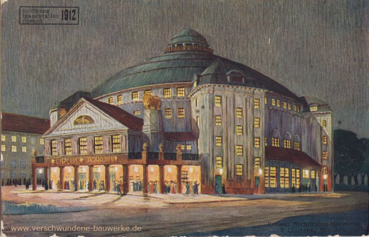 Das Kuppelgebäude wurde von dem in Chemnitz geborenen und in München tätigen Architekten Max Littmann entworfen und durch die Bauunternehmung Heilmann & Littmann ausgeführt. Im Mai 1911 begannen die Bauarbeiten für das später 3860 Menschen fassende Gebäude. Sein Herzstück war der frei gespannte Kuppelraum mit einem Durchmesser von 46,50 m und einer lichten Höhe von 28,95 m, seine gesamte Höhe betrug 35,75 m, die Manege erhielt die Standardabmessungen von 13,20 m im Durchmesser, sie konnte abgesenkt und mit Wasser gefüllt werden; die Bühne erreichte eine Höhe von 17,15 m und wurde mit einem Asbestvorhang abgeschlossen.