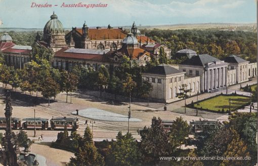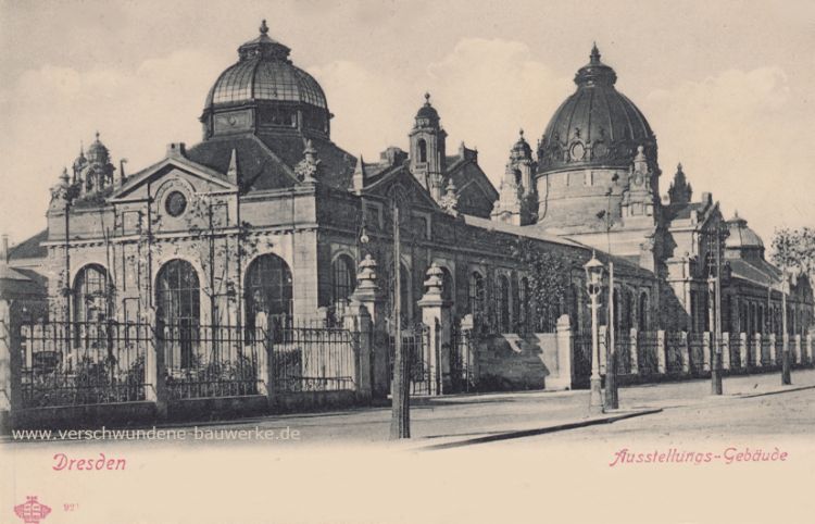 Die äußere Fassade war von hohen rechteckigen Fenstern geprägt, die einer bestmöglichen Ausleuchtung der Innenräume dienten. Der Bereich des Haupteingangs an der Stübelallee bildete den architektonischen Schwerpunkt auf der Nordseite des Gebäudekomplexes. Hier konzentrierte sich der figürliche und ornamentale Bauschmuck der im Stile der Neorenaissance gehaltenen Sandsteinfassade. Im Giebel des Mittelrisaliten befand sich ein plastisches Relief, das eine sitzende Frauenfigur darstellte. Dieses Giebeldreieck wurde von wuchtigen und ornamental überladen wirkenden Türmen flankiert, hinter denen sich die mit Blech gedeckte Hauptkuppel erhob. Die seitlichen Gebäudeflügel verliehen dem Gebäude eine enorme Länge und verfügten durch die große Fensterzahl nur über eine untergeordnete architektonische Ausstrahlung. Ihre Kopfenden kulminierten jeweils in einen quadratischen Hallenbau mit kleinerer Glaskuppel. Vom mächtigen Dach des sich südlich erstreckenden Hauptsaalflügels war von der Stübelallee aus wenig zu sehen, da die Hauptfront ihn wegen ihrer Länge weitgehend verdeckte. Nur von der Gartenseite aus konnte man seine Ausdehnung erahnen. Hier legten sich zwei kleine Flügelbauten vor den zentralen Hauptsaal.Der Grundriss des Ausstellungspalastes veränderte sich über die Jahre durch zahlreiche Anbauten mehrfach. Ursprünglich hatte er die Form eines "T", dessen besonders lange waagerechte Balken in West-Ost-Richtung parallel zur Stübelallee verliefen und zusammen eine Gesamtlänge von 177 Metern hatten. Im 21 Meter breiten Hauptgebäude befanden sich vier Ausstellungshallen, der Kuppelsaal, Verwaltungsräume und Garderoben. Im südlich und dazu rechtwinklig angrenzenden Flügel befanden sich der Hauptsaal für die Eröffnungsfeier und spätere Tagungen sowie zwei weitere Nebensäle und zwei Zwischenhallen. Im Hauptsaal existierte eine Galeriebene und an seiner südlichen Rückwand die große Musikbühne, die für 100 Musiker und 150 Sänger ausgelegt war.