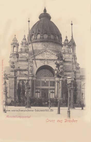 Den ersten Archtekturwettbewerb 1888 gewann der Architekte Alfred Hauschild (Stadtbaurat in Dresden von 1890 bis 1910), seine sehr kostenintensiven Entwürfe erforderten eine Umarbeitung durch zwei weitere Architekten. Der sächsische König hob 1894 das auf diesem Landesareal liegende Bauverbot auf. Die Bauausführung für das Hauptgebäude, das Verwaltungsgebäude und den Musikpavillon lag in der Verantwortung von Stadtbaurat Edmund Bräter und Stadtbaumeister Richard Möbius. Die Baurbeiten kosteten 1.464.277 Mark, die Errichtung der Nebenanlagen 125.833 Mark. Der im Ausstellungspark gelegene Teich und die angrenzenden Parkanlagen kosteten 40.000 Mark und wurden in Regie der Ausstellungskommission errichtet. Die Wegebauten, Tiefbauarbeiten und Rasensaaten erfolgten mit städtischen Mitteln.