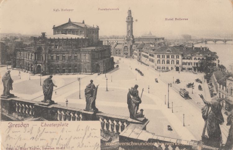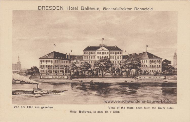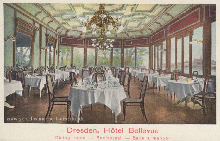 Das Gebäude, auf ehemligem Festungsraum als Zuckerraffinerie errichtet, ist als solche von 1822-1841 genutzt worde, nach entsprechendem Umbau hat es zu Wohnzweckenund als Ausstellungslocal des sächsischen Kunstvereins gedient, aus welchem es 18973 für den Preis von 1.650.000 RM in die Hände einer Actiengesellschaft überging. Es enthält im Souterrain des östliche Flügels (nach dem Theaterplatze) Küchen-, Wirthschafts- und vorrathsräue, im Parterre dergleichen Räume, ferner die Repräsentationsräume des Hauses, den 16,5 m langen, 6,5 m breiten, leider sehr niedriegen Speisesaal, und im Übrigen weit über 100 Logirzimmer."