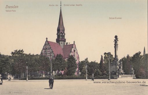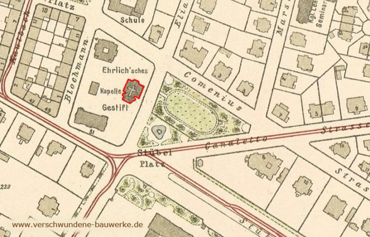 Die von Karl Emil Scherz im Stil des Historismus erbaute und 1907 geweihte Ehrlichsche Gestiftskirche am Stübelplatz war der Ersatzbau für die ältere Kirche (Lazarettkirche) des Ehrlichschen Gestifts am Wettiner Platz. Sie wurde nach ihrem Stifter, dem Dresdner Kaufmann und Ratsherr Johann Georg Ehrlich (1676-1743), benannt und mußte 1897 dem Neubau der Jacobikirche weichen.